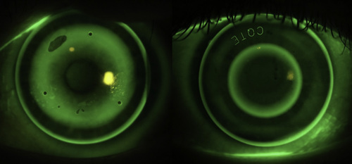 A comparison of orthoK lens designs. Left: An ‘adult’ orthokeratology lens (BE, Capricornia, AUS). BOZD >6mm, e=0. Right: A customised lens for myopia control (Eyespace Forge design, CLC, NZ) BOZD 5.5mm, e=0.99