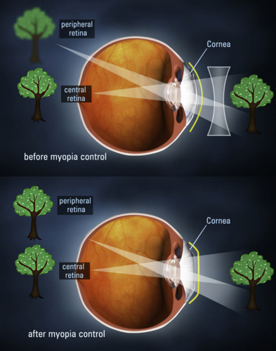 The effect of orthokeratology lenses on peripheral lights rays. Focusing light at or in-front of the retina is believed to be protective against myopia progression. Image courtesy of Visique Rose Optometrists