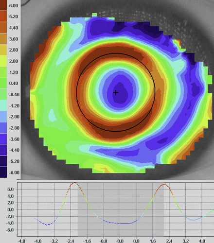The tangential difference map of a myopia control orthoK lens design for a -3.75D young myope. Note the small, highly aspheric treatment zone and the position of the paracentral ring of steepening within the pupil zone