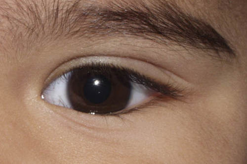 Fig 3. Epiblepharon: the skin/muscle fold is pushing lashes onto the globe, but the eye is quiet