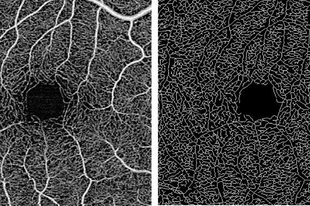 OCT angiogram of a healthy eye (left) and an accompanying binary image of its vessel skeleton (right). Credit: Dr Kyle Green