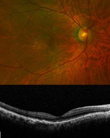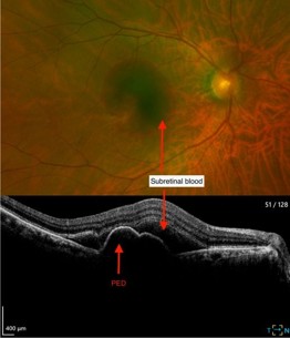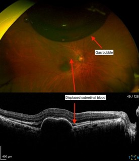 Examination should include visual acuity, intraocular pressure measurement, slit-lamp examination and fundoscopy to determine the extent and location of the haemorrhage (presence of vitreous, pre-retinal, intraretinal, subretinal, sub-retinal pigment epithelium (RPE) haemorrhage). For imaging, optical coherence tomography (OCT) is mandatory to determine whether the bleed is subretinal or sub-RPE, which will affect management decisions. Colour fundus photos can also assist in differentiating the anatomical layers – pre-retinal haemorrhage will obscure retinal vasculature, whilst subretinal haemorrhage has a lighter colour than sub-RPE bleed.