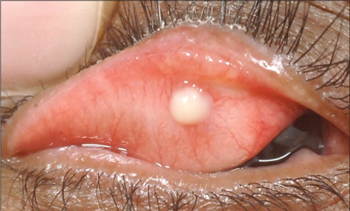 Also known as a blocked sweat gland, these clear fluid-filled cystic lesions are very common around the eye due to thin skin and poorly understood genetic factors. Yellow fluid-filled lesions are known as inclusion cysts. They often occur in multiple groups, increase in size with heat and shrink in the cold. Since they do not spontaneously resolve, they require excision or the patient must live with it (Fig 1, above).