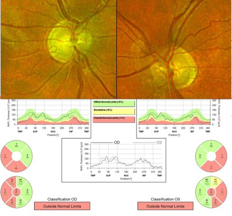 Fig 4. Optos photos of the optic nerves of a patient with optic atrophy due to a pathogenic variant in the OPA1 gene, showing bitemporal disc pallor (above) and corresponding inferotemporal retinal nerve fibre layer thinning (below). This patient is eligible for the Myrtle PYC-001 trial