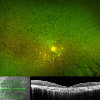 Fig 5. Optos photo and OCT of the fundus of a patient with advanced rod-cone retinal dystrophy and counting-fingers vision. The OCT shows loss of photoreceptors, but preservation of the inner retinal layers, including the retinal nerve fibre layer, which is the target for KIO-301 optogenetic therapy