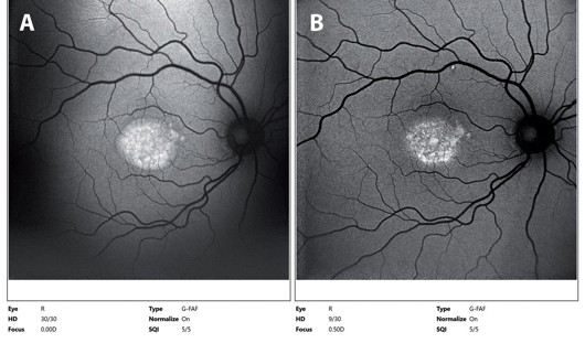 Fig 3. A. At baseline, fundus autofluorescence images shows the extent of subretinal fluid as demarcated by hyperautofluorescence. B. Following laser, there is reduced hyperautofluorescence without any new areas of laser-induced changes, with the exception of a single titration laser spot at the superior arcade. Extent of residual changes reflect the chronicity of the oedema and helps explain the limited functional improvement