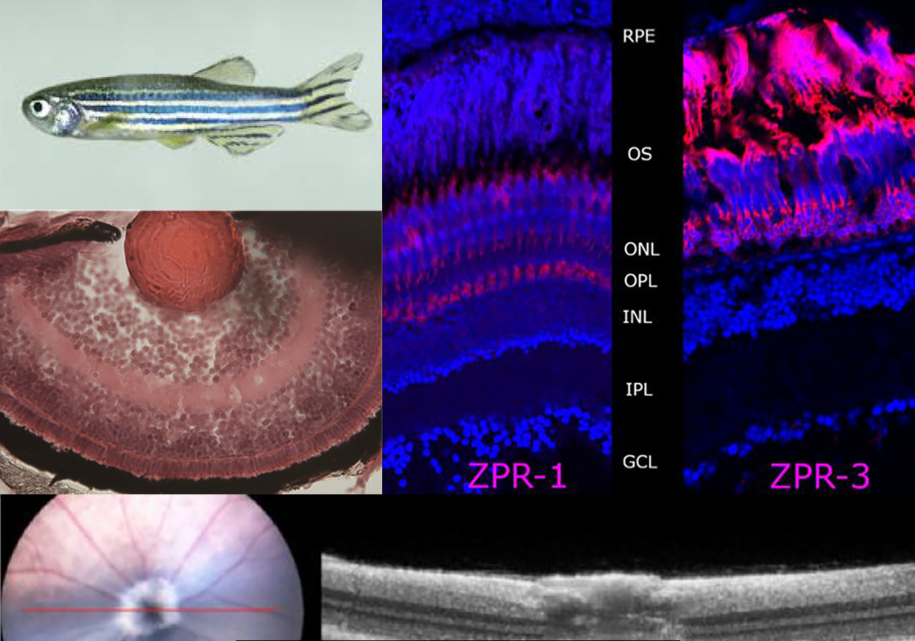 Fig 3. Zebrafish models of human inherited retinal disease can be created using CRISPR/Cas gene editing can can be well characterised histologically, with immunohistochemistry and OCT