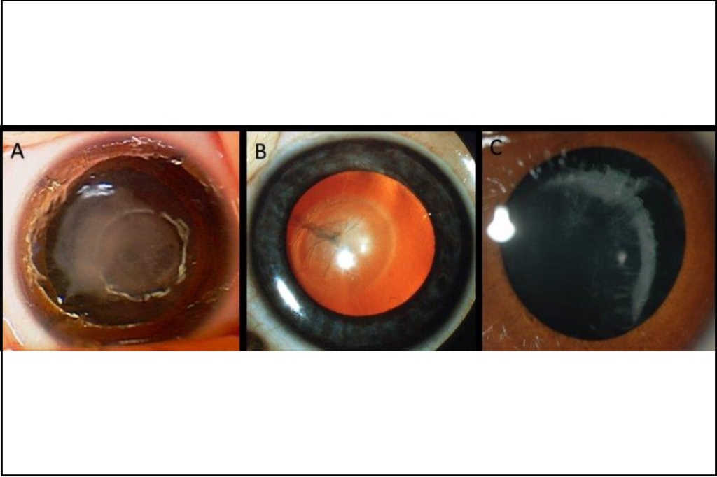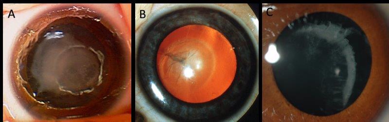 Fig 3. Examples of inherited cataract: A) dense unilateral congenital cataract at birth in a baby with trisomy 21; B) persistent foetal vasculature with posterior lens opacity (Credit: Dr Justin Mora); C) cortical cataract and lens subluxation in a child with Knobloch