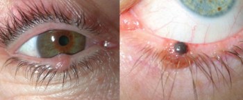 Also very common, either pale or pigmented naevi can lie on lid margin or on the anterior surface of the lid. They often look fleshy and are present from birth but grow with age and often only become noticeable in adulthood. Naevi are never associated with hairs growing through lesions or madarosis.