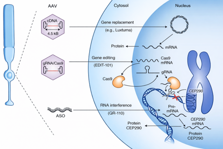 Gene editing and RNA-based therapies, including CRISPR-Cas systems and antisense oligonucleotides, are particularly relevant for large genes that exceed the packaging capacity of AAV vectors. For example, these approaches are being explored in CEP290-associated Leber congenital amaurosis (LCA10)7 (Fig 2).