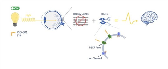Fig 6. Illustration of optogenetic therapy with KIO 301. When exposed to light, KIO-301 flips into its ‘on’ position. This disrupts the flow of ions, which activates RGCs to process and relay light signals to the visual cortex