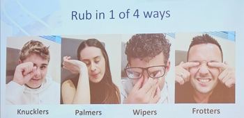 Dr Trinh then tackled the difficult question of what sort of eye rubber are you – a knuckler, palmer, wiper or frotter? (Fig 1). There are three reasons to rub: itchiness, dry eyes or habit. She then showed a very damning video of what happens to an eyeball as it is being rubbed. There is no social stigma to eye rubbing and it is often innocent, unconscious behaviour. A chronic rubber needs a support person to be appointed to give verbal reminders (or a kick under the table) to stop rubbing. Sometimes people don’t rub during the day, explained Dr Trinh, and allergy sufferers will rub particularly after they get out of a hot shower, which causes a histamine release.
