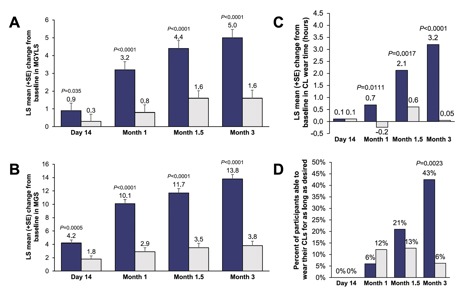 Fig 2: Change from baseline in MGYLS (A), MGS (B), comfortable CL wear time (C) and the proportion of participants who could wear their CLs for as long as they wished (D), over a three-month period of use from the phase 2 study.